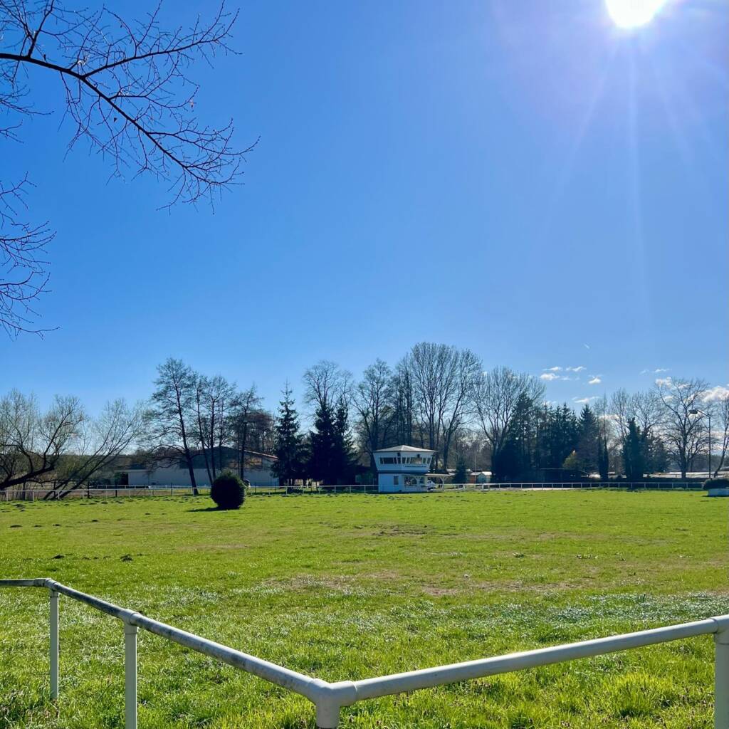 Springturnier: 1 Abreiteplatz (Sand, >20×60), 1 Reithalle (zum abreiten, 20×40), 1 Turnierplatz (Rasen)